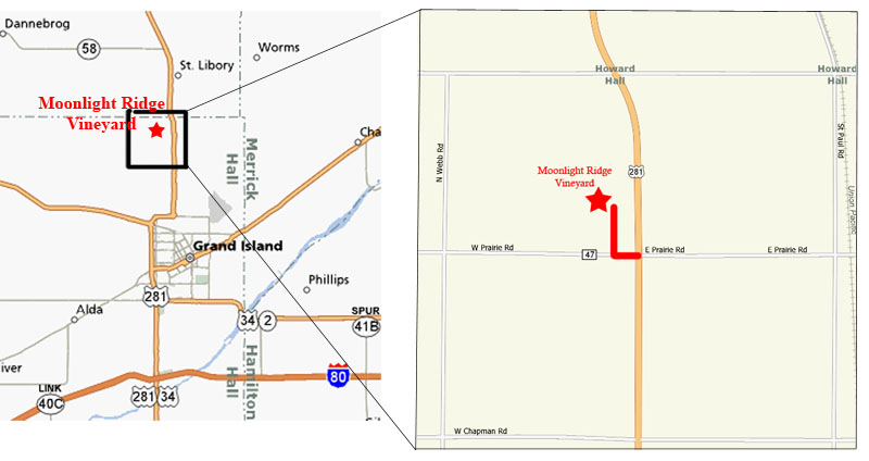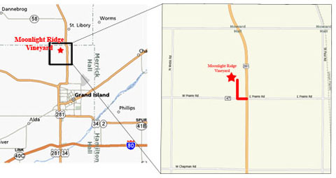 Moonlight Ridge Vineyard is located on U.S. Hwy 281 just 15 to 20 minutes north of Interstate-80 exit 312, or 6 miles north of Grand Island, Nebraska at the corner of U.S. Hwy 281 and Prairie Rd. Five miles to the north is the small town of St. Libory long touted as the watermelon capital of Nebraska. Produce has been grown in this area for over 80 years with the Placke family being a major part of that tradition. The U.S. Hwy 281 corridor between Grand Island and St. Libory, coined as "Melon Lane", now has a splash of the grape. Just watch for Prairie Road and turn west off of U.S. Hwy 281. Our entrance road runs parallel with the highway. We have plenty of parking. Buses and RV's are welcome!
